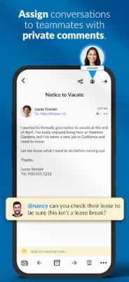 Aptly objedinjuje sve vaše komunikacione kanale – e-poštu, SMS i glasovne pozive – u jednu centralizovanu platformu. Prestanite sa stalnim prebacivanjem između različitih softvera za upravljanje imovinom, prijemnih sandučadi, tabela i aplikacija. Na ovom jedinstvenom mestu, svi članovi tima mogu da delegiraju zadatke, dele razgovore i efikasno upravljaju celokupnim tokom posla, od početnih faza zakupa do finalnih koraka iseljenja. Iskoristite snagu automatizacije za rutinske zadatke i komunikaciju, osiguravajući da se sve obavlja brže i sa manje napora, omogućavajući vam da upravljate većim brojem nekretnina sa znatno manjim opterećenjem.