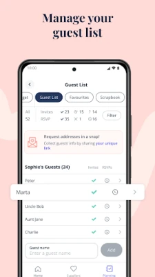 Učinite planiranje zajedničkim iskustvom. Povežite svoj nalog sa partnerom i zajedno kreirajte svaki detalj vašeg velikog dana. Dodeljujte zadatke putem deljene liste obaveza, istovremeno upravljajte listom gostiju sa različitih uređaja, ili čak uključite članove porodice da pomognu. Uz Bridebook, odbrojavanje do sudbonosnog "Da!" postaje još uzbudljivije – jednostavno unesite datum venčanja i pratite preostale dane, personalizujući ga omiljenim fotografijama. Vaša personalizovana lista zadataka osigurava da nikada ništa ne propustite, vodeći vas korak po korak kroz ceo proces, uz mogućnost dodavanja sopstvenih unosa. Upravljanje gostima je takođe olakšano: pratite potvrde dolaska, dodatne osobe i specifične zahteve u ishrani, pa čak i prikupite sve kontakt podatke jednim klikom.