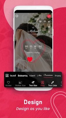 Sa aplikacijom Wedding Countdown, vi ste dizajner sopstvenog savršenstva. Istražite brojne šablone i opcije za oblikovanje koje funkcionišu poput profesionalnog uređivača fotografija, omogućavajući vam da prilagodite svaki aspekt odbrojavanja – od fonta i veličine teksta do boja i celokupnog vizuelnog identiteta. Osim očaravajućeg odbrojavanja, aplikacija nudi i intuitivan kreator pozivnica. U samo dva koraka, odaberite predložak, dodajte svoje detalje i kreirajte elegantne, potpuno prilagodljive pozivnice, spremne za vašu jedinstvenu priču, bez složenih procedura. Dodatna galerija pozadina pruža inspiraciju za svaki detalj.