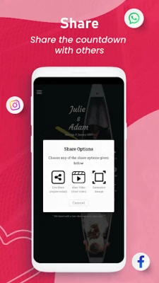 Wedding Countdown je više od pukog odbrojavanja; to je vaš sveobuhvatni asistent za planiranje venčanja. Efikasno organizujte sve obaveze pomoću elegantnog kreatora liste zadataka, dopunjenog podsetnicima, i sastavite preciznu listu gostiju, sve na jednom mestu. Kada je vaše odbrojavanje ili pozivnica savršeno, lako ih podelite sa porodicom i prijateljima putem društvenih mreža, bilo kao prelepu sliku, video ili direktno iz aplikacije, služeći kao šarmantan podsetnik na datum. Dodatno, inspirativni dnevni ljubavni citati, iz kolekcije od preko 200, osiguraće da svaki dan do venčanja bude ispunjen pozitivnom energijom i iščekivanjem.